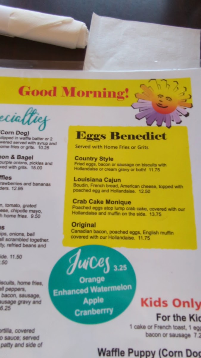 1 Italian sausage dipped in waffle batter served with syrup and powdered sugar, home fries, or grits